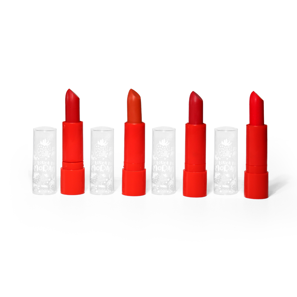 O Batom Loucas por Morango traz uma coleção exclusiva com 4 tons de vermelho que vão conquistar todos os gostos e ocasiões! Seja para um look mais clássico ou ousado, você encontrará o tom perfeito para arrasar. Cada cor foi cuidadosamente desenvolvida para proporcionar uma textura cremosa, hidratação e uma pigmentação intensa, tudo isso com aquele aroma delicioso de morango que encanta.